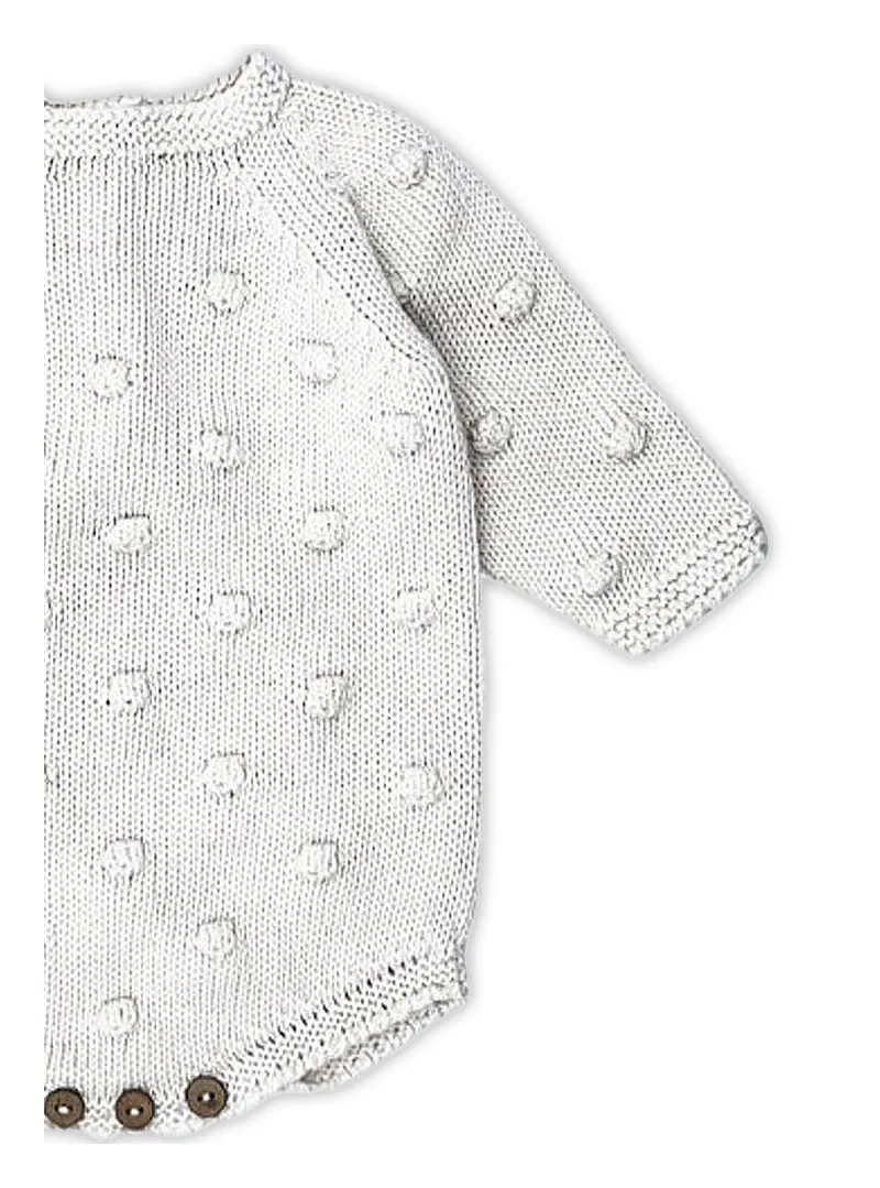 The Thiery onesie by Li & Me is practical and soft, featuring textured polka dot knit and wood-effect buttons for easy changes.