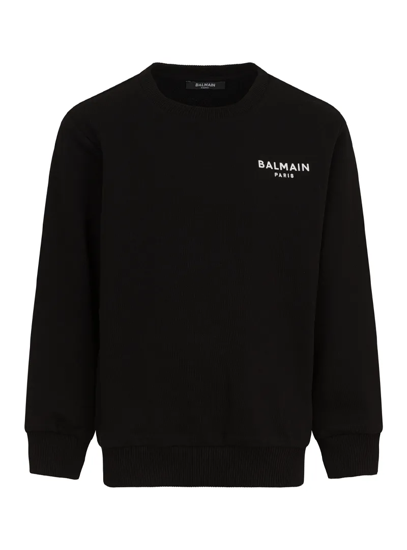 A Balmain sweatshirt featuring a micro logo application on the heart side, finished with ribbed cuffs and hem for an elegant and comfortable style.