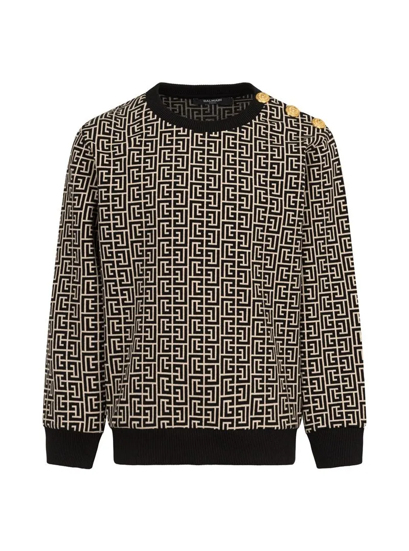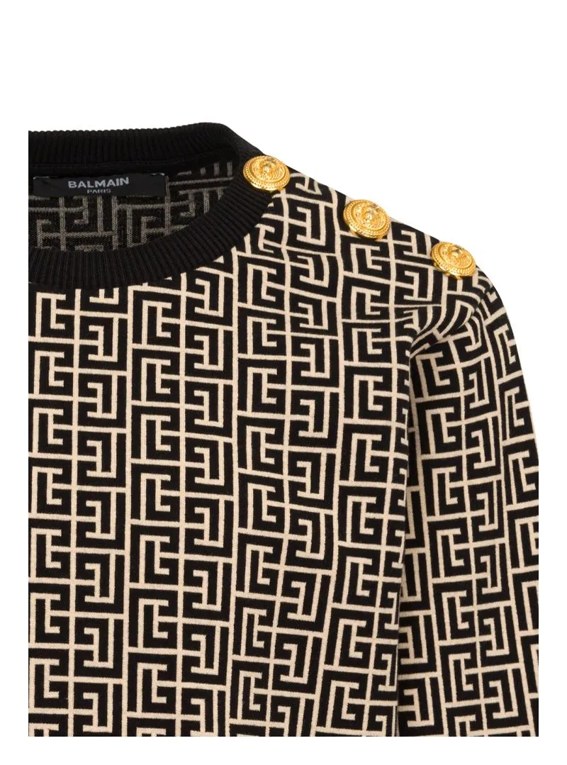 A Balmain sweatshirt featuring an all-over logo design, gold buttons, and contrast cuffs and hem, ideal for a bold and sophisticated style.