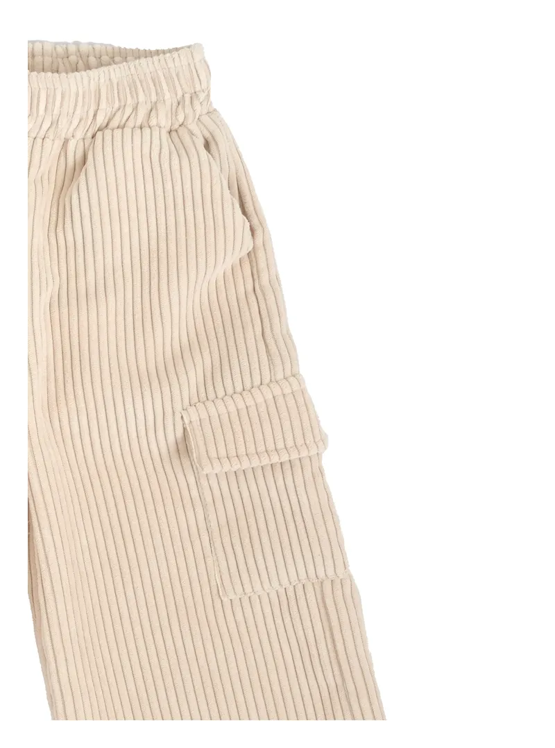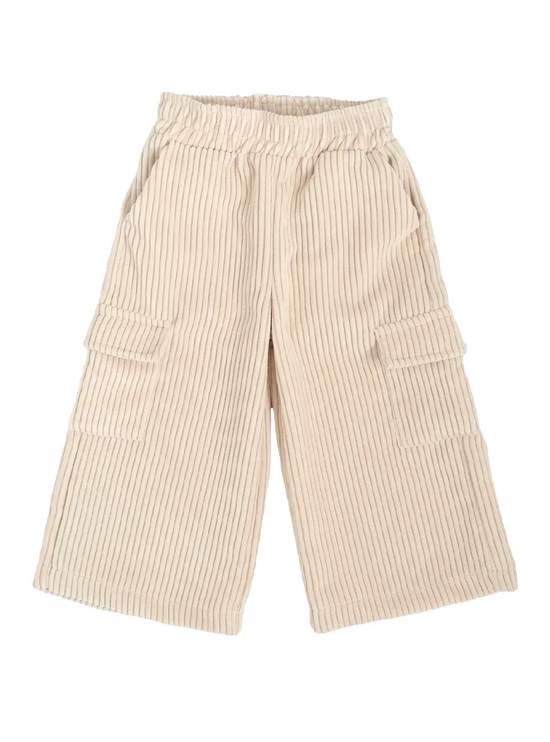 Stretch corduroy trousers with flap pockets and palazzo fit, featuring internal elastic waistband and zip and button closure.