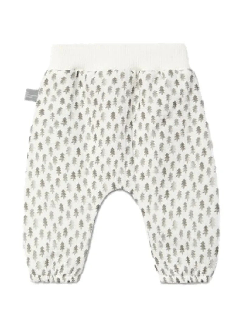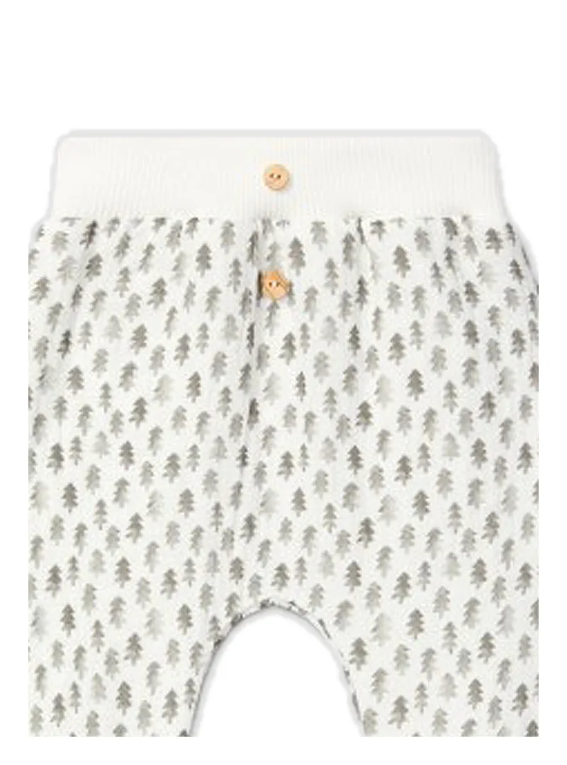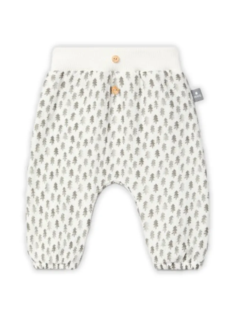 Snug pull-up pants in printed cotton muslin, lined with warm cotton jersey and decorative wooden buttons on the front.