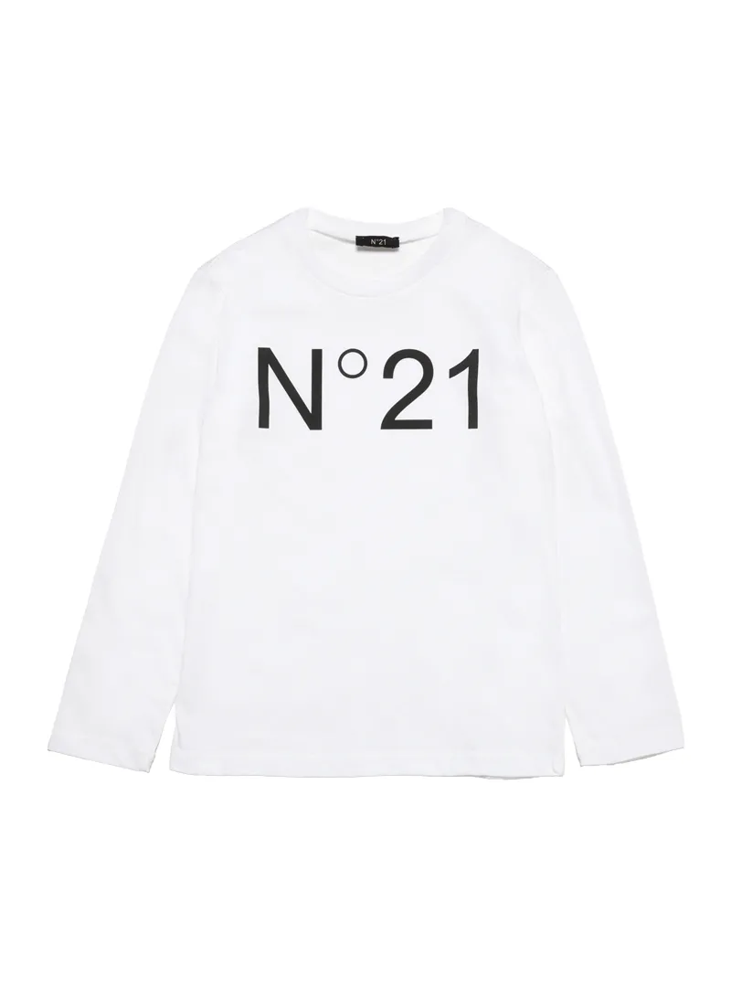 Crafted from cotton jersey fabric, the White Long-Sleeved T-Shirt by N.21 Kids is perfect for everyday comfort. The regular fit and contrasting logo print make it a versatile and fashionable piece. Features: • Fabric: 100% cotton • Contrasting logo print • Regular fit • Care: Hand wash or machine wash on a delicate cycle.