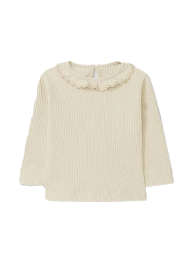 Longsleeve in ribbed organic and recycled cotton jersey, featuring a delicate embroidered ruffled collar for a soft and feminine touch.