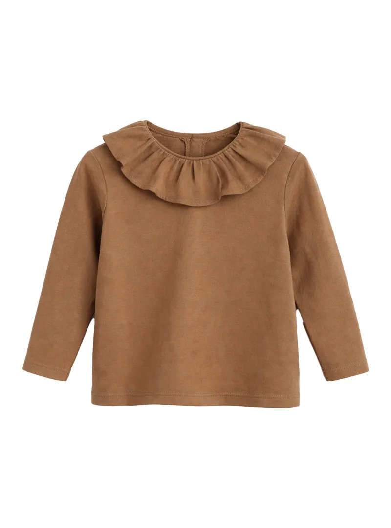 Warm cotton T-shirt with petal trim collar, sweet and refined for casual and romantic looks.