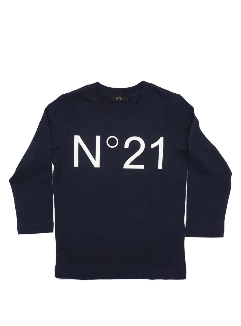The blue long-sleeved T-shirt by N.21 Kids is made from soft cotton jersey, ensuring comfort and breathability all day long. The simple yet modern design is enhanced by a contrasting logo print, adding a stylish touch. The regular fit makes it a versatile piece, perfect to pair with jeans or casual trousers, ideal for both school and leisure time.