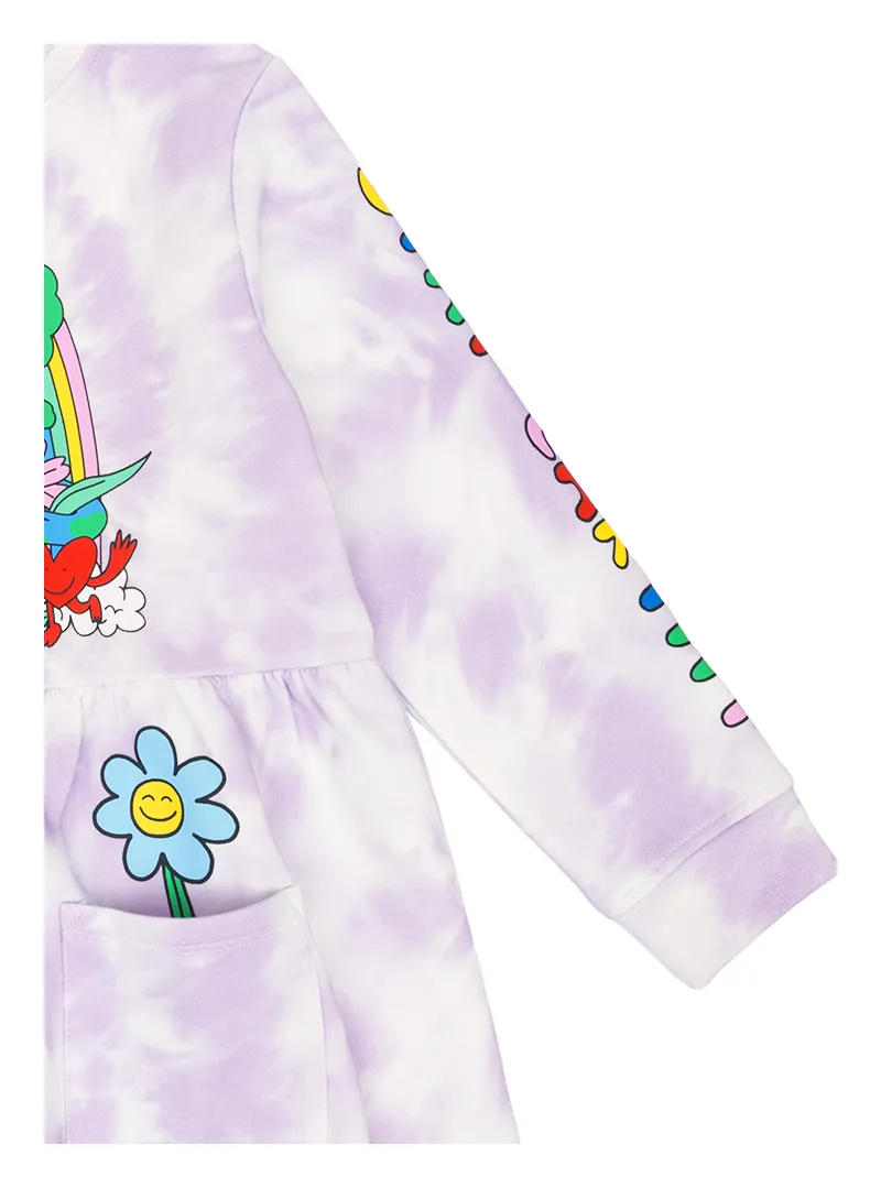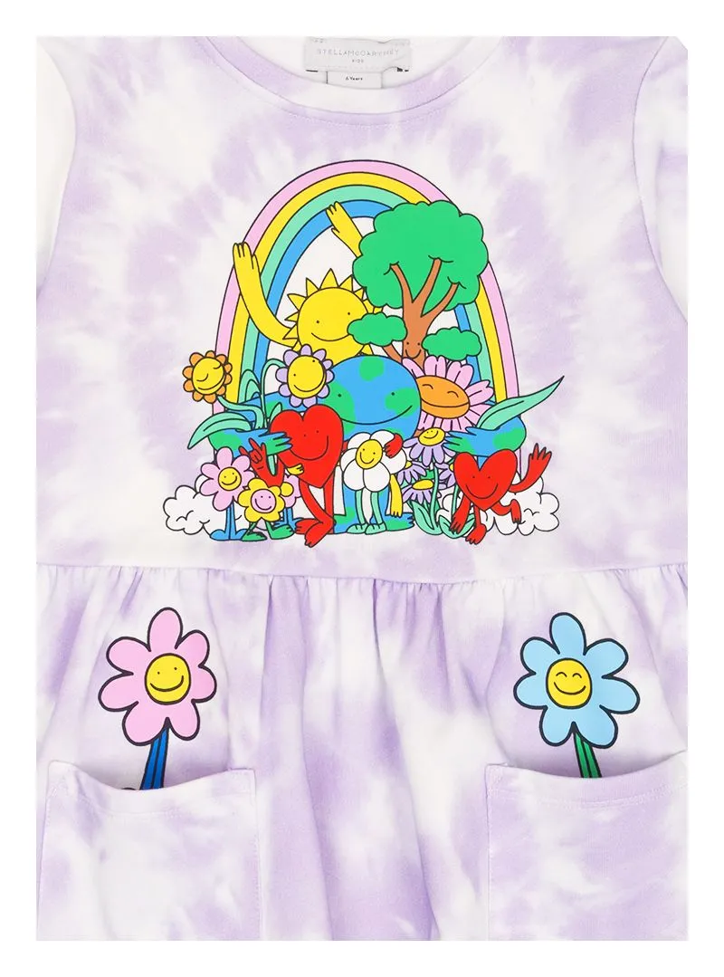 Un abito felpa di Stella McCartney con stampa maltinto su maniche e davanti, arricchito da applicazioni floreali per un look originale e raffinato.