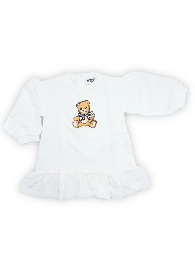 Un abito in felpa dal taglio morbido, impreziosito da un orsetto con fiocco e paillettes. Il fondo con rouches e le maniche ampie con soffietto aggiungono un tocco raffinato e originale.