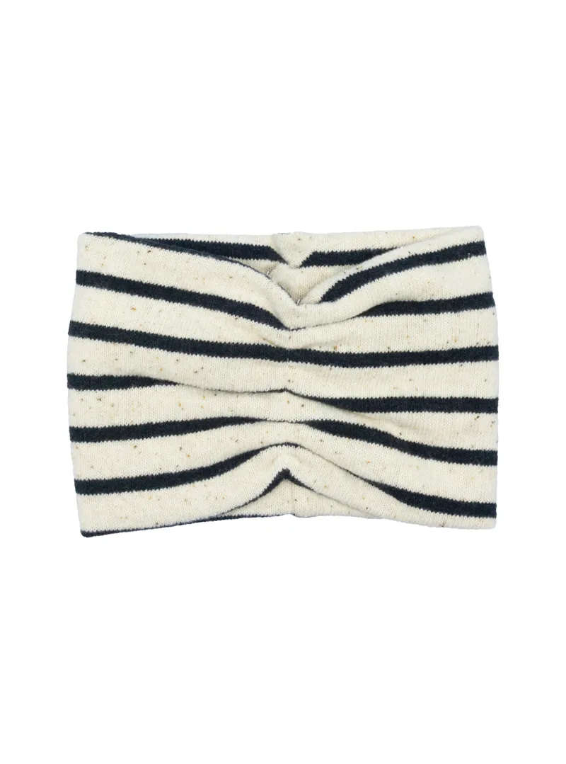 Fascia capelli larga rigata in caldo cotone con applicazione pon pon a contrasto, calda e originale per un tocco di stile unico.