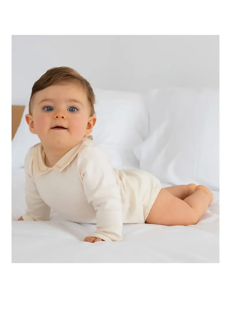 Con bottoncini a pressione lungo la schiena (taglie 0/1M e 3M con apertura completa, taglie 6M e 9/12M con apertura parziale).