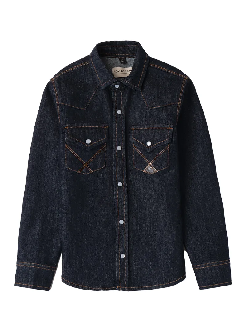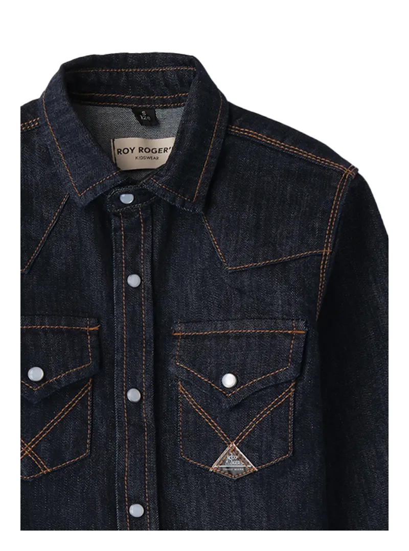 Camicia jeans Roy Rogers bambino in lavaggio rins con stile western e dettagli curati come tasche applicate, ricamo incrociato e bottoni a contrasto.