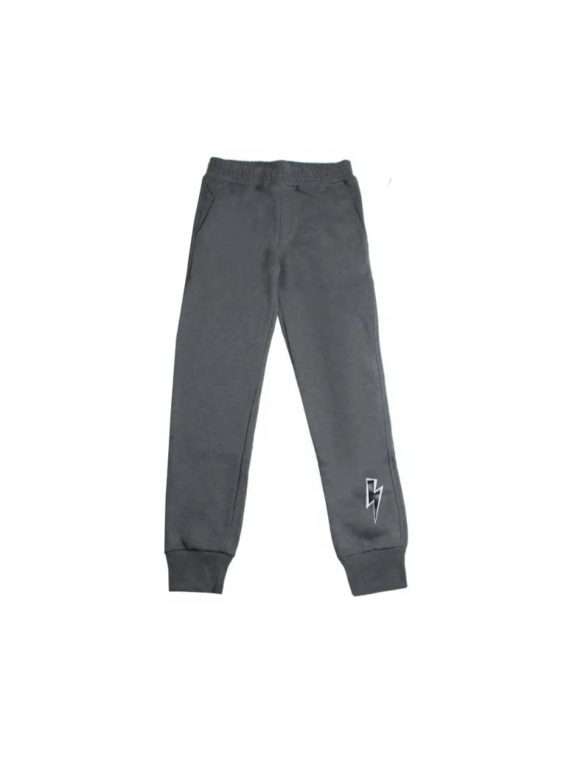Pantaloni felpa di cotone con molla in fondo by Neil Barrett Kids, elasticato al punto vita, 2 tasche laterali, stampa gommata fulmine su caviglia.
