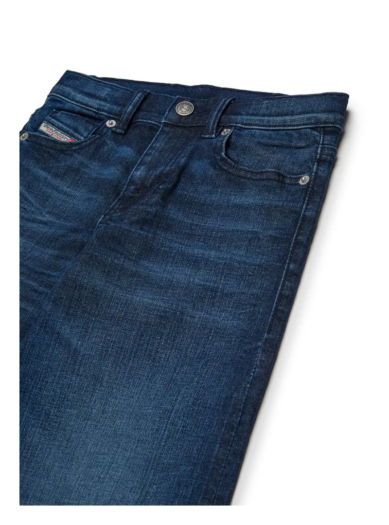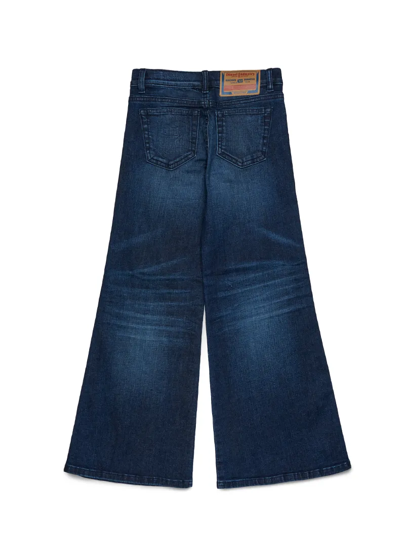 Pantalone Diesel in denim stretch a gamba larga con fondo sfrangiato e dettagli used, perfetto per uno stile audace e contemporaneo.