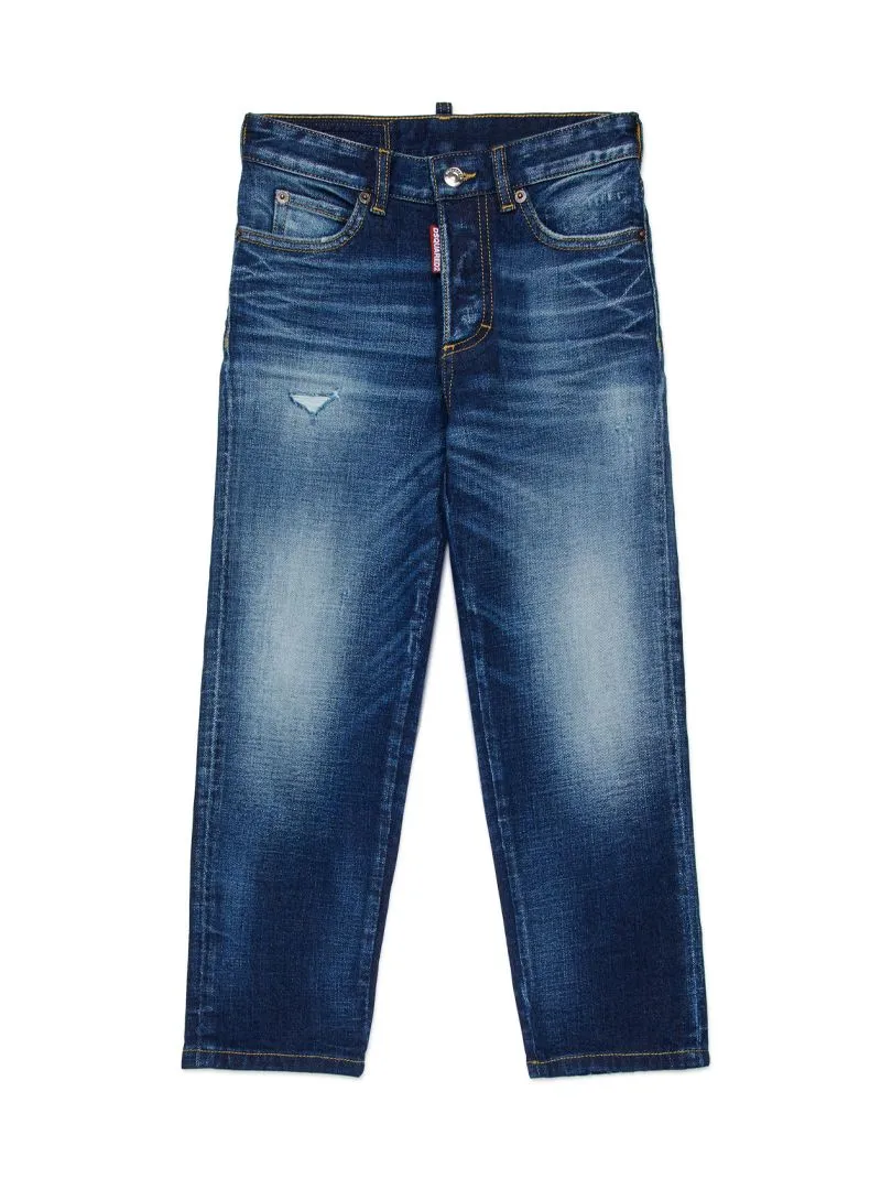 Pantalone jeans Dsquared2 con rotture frontali ricucite per uno stile urbano e vissuto.