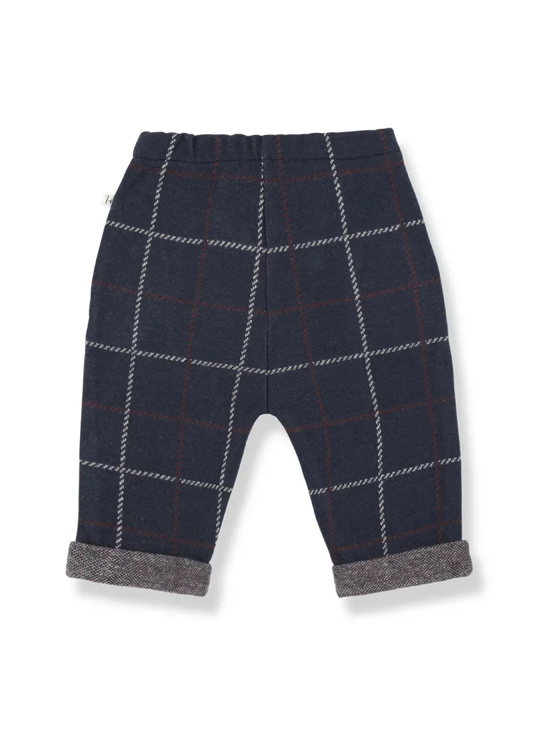 Pantalone Robin firmato 1+ in the family: un modello in tessuto caldo a fantasia check, dotato di vita elasticizzata e laccetto regolabile, perfetto per un abbigliamento pratico, comodo e curato nei mesi più freddi.