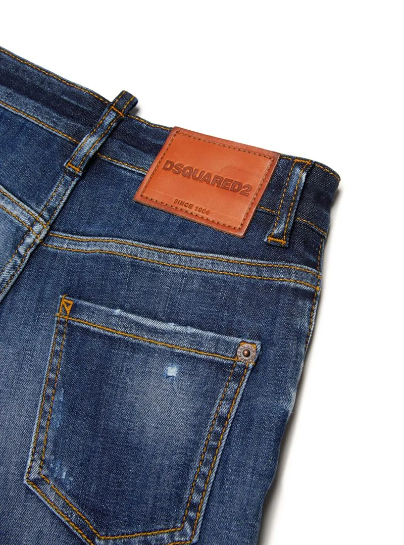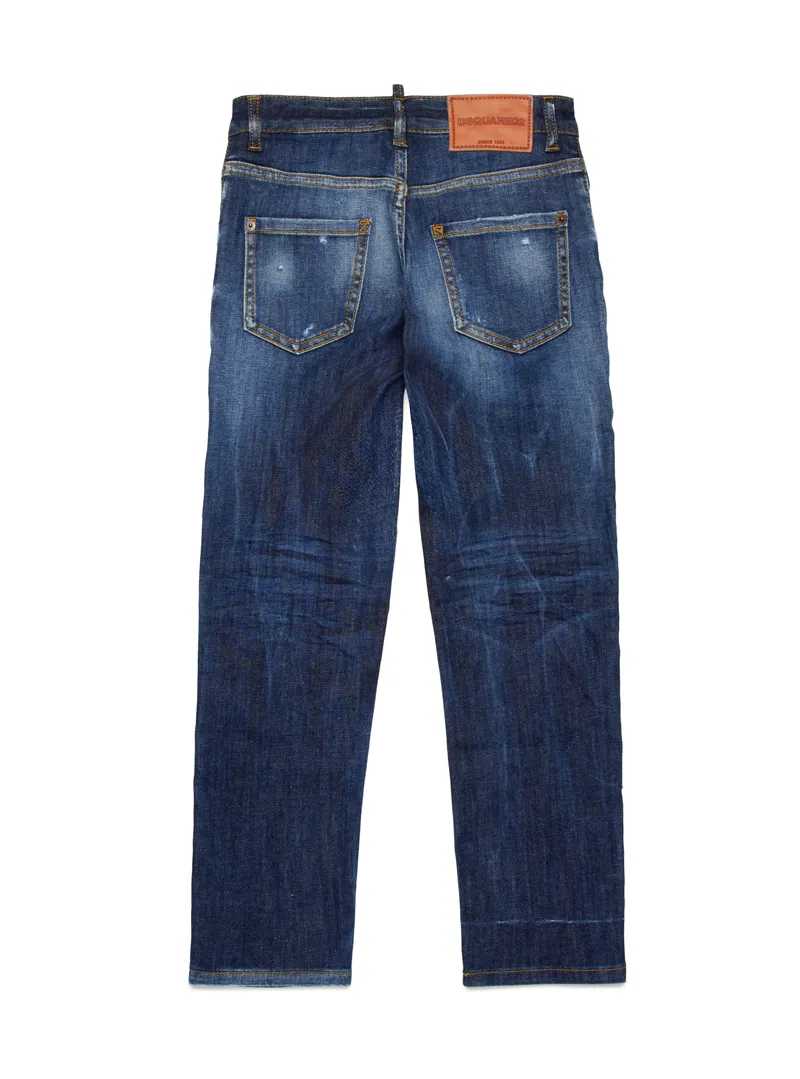 Pantalone jeans DSQUARED in denim stretch con effetto used e rotture, per un look grintoso e moderno.