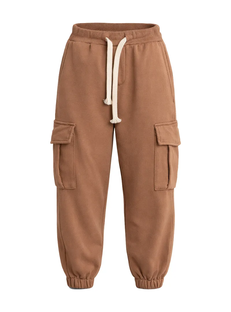 Pantalone in felpa con tasconi e pattina, tasche a filetto, coulisse in vita ed elastico al fondo, pratico e confortevole per look casual e sportivi.