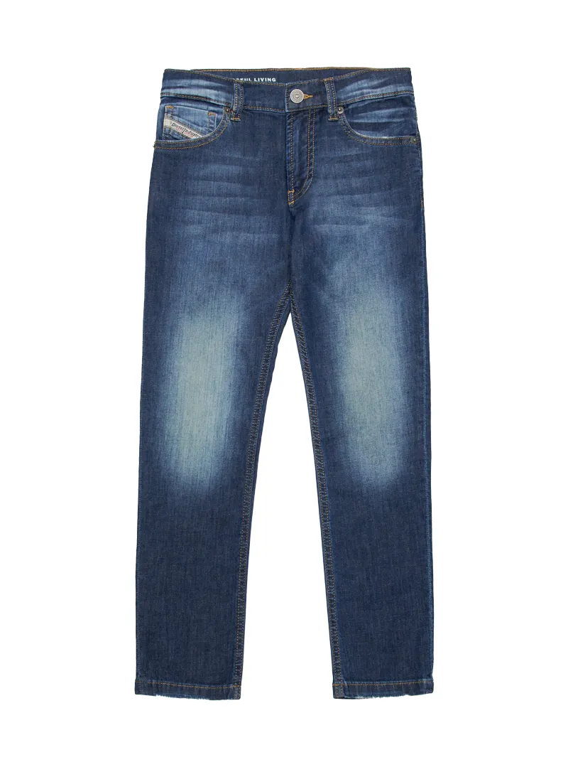 Pantalone jeans elasticizzato con gamba asciutta, lavaggio medio, tasche rifinite con rivetti in metallo, logo su taschino e cuciture a contrasto per un look moderno.