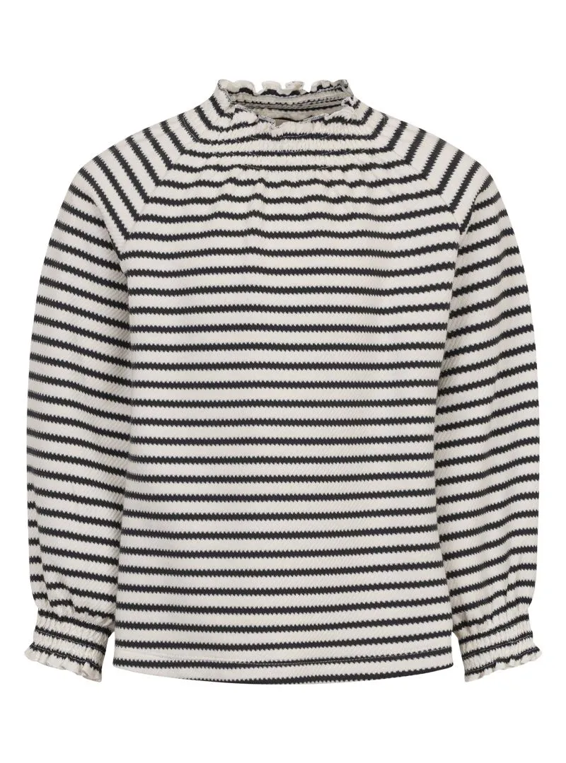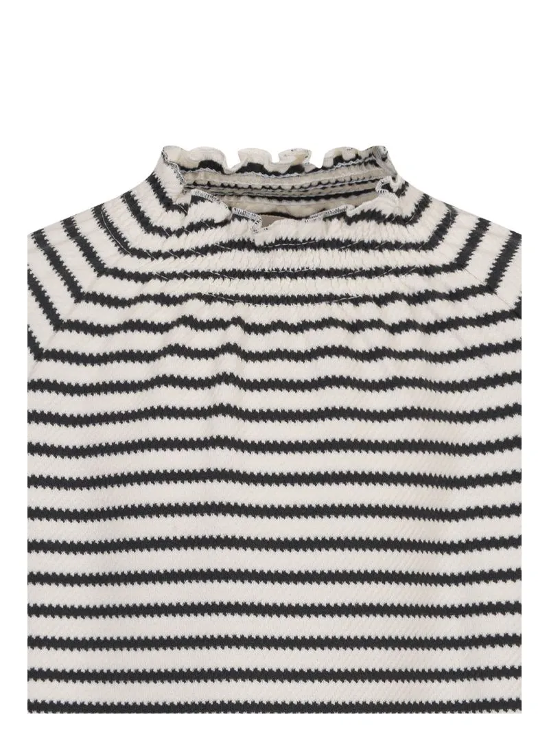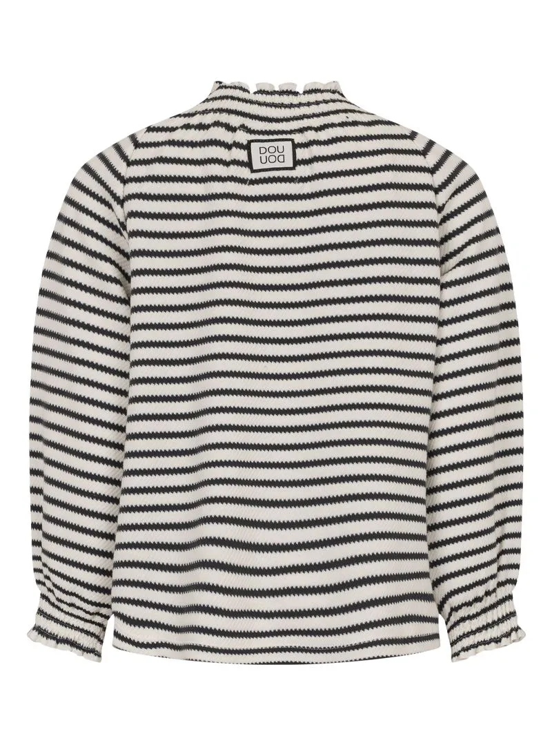 T-shirt rigata Douuod in jersey stretch, con collo rialzato e arricciature su polsi e scollo per un tocco delicato e raffinato su un capo comodo e versatile.