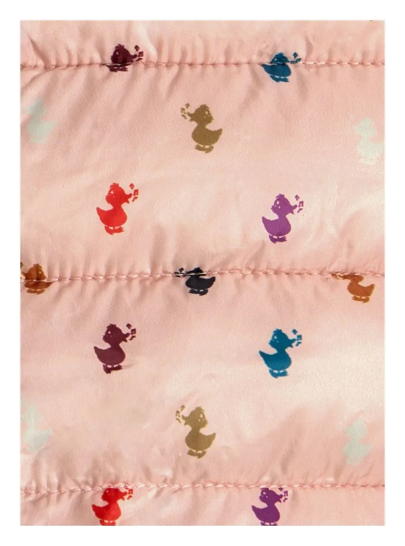 La tuta neve Cas è calda e funzionale, in ecopiuma e tessuto semilucido, con guantini e scarpine coordinati e una simpatica fodera a contrasto con stampa papere allover.