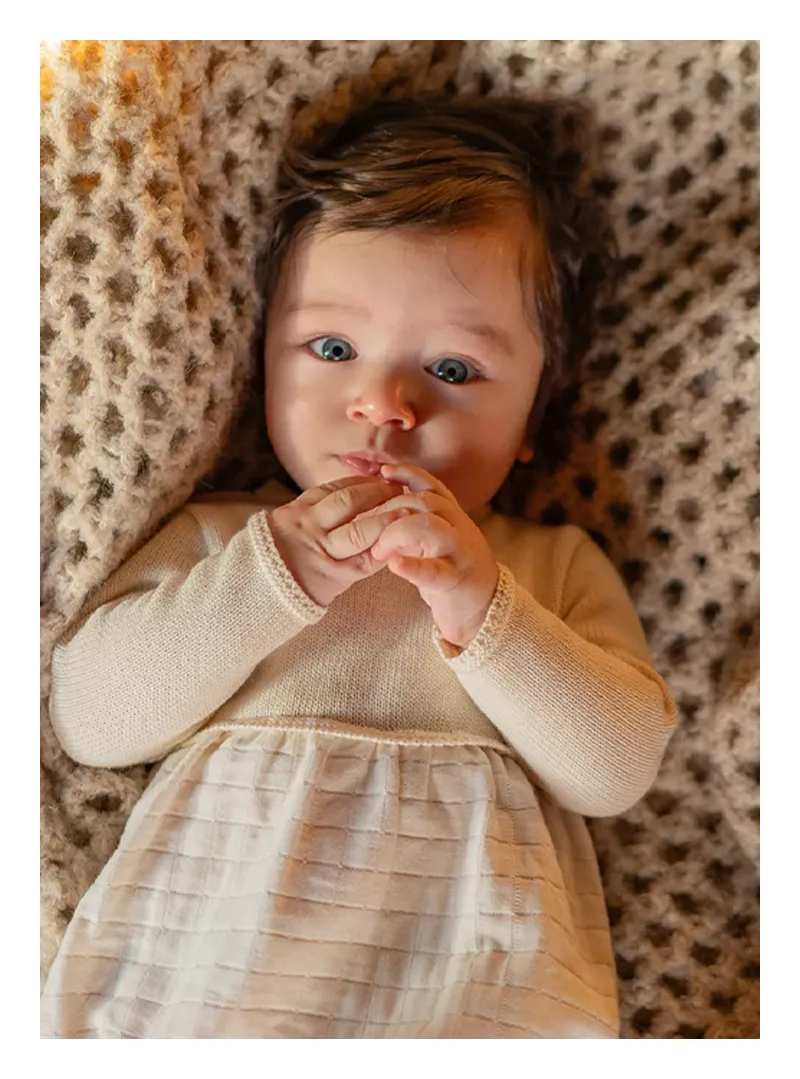 Tutina a gamba corta in doppio tessuto tubico e filo di cotone, con apertura sul retro e sul fondo per un cambio facile e comodo.